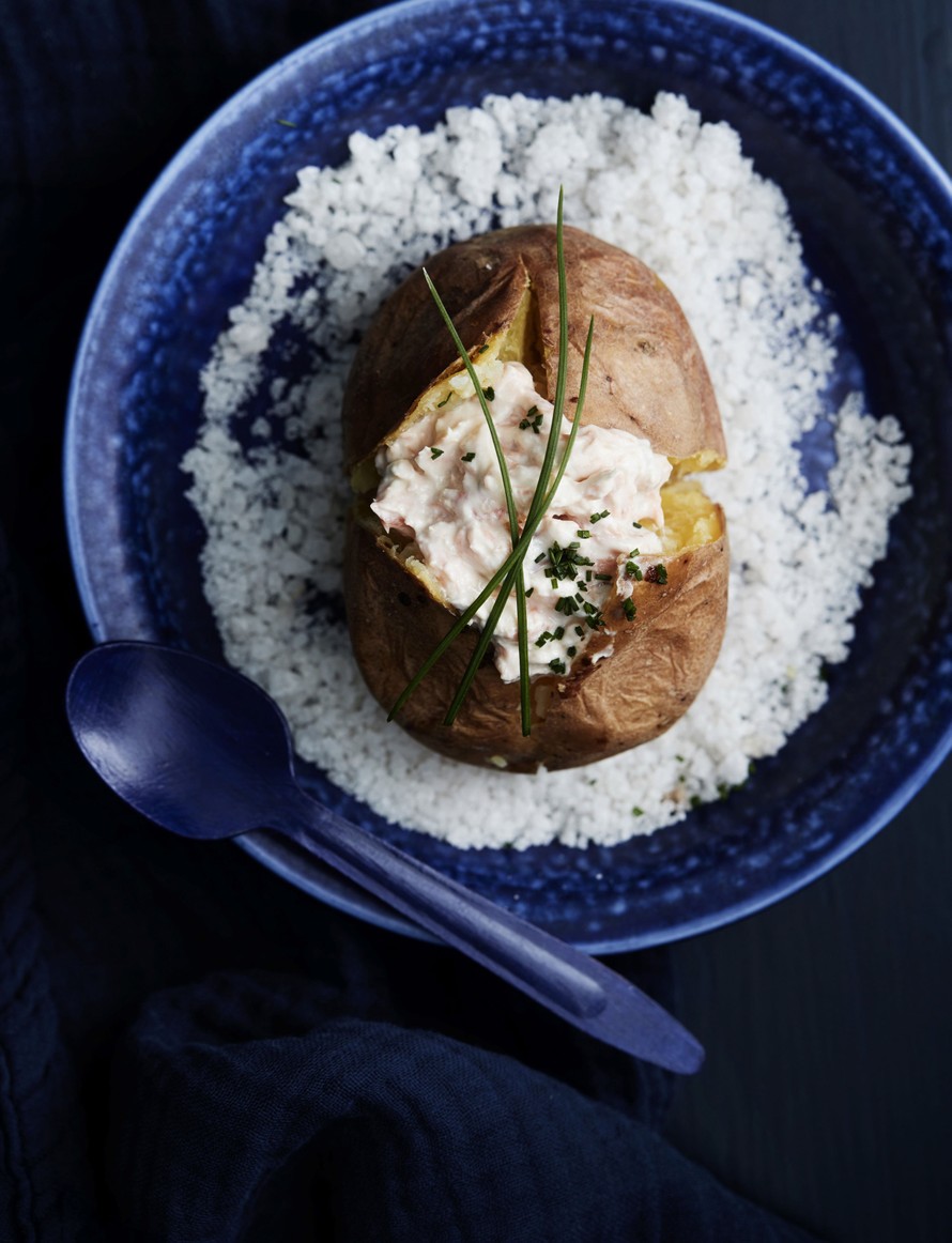 Maukkaiden uuniperunoiden salaisuus on rapea pinta ja niin ihanan pehmeä sisus. Tällä kertaa perunat saavat kaverikseen täyteläisen savulohitahnan.