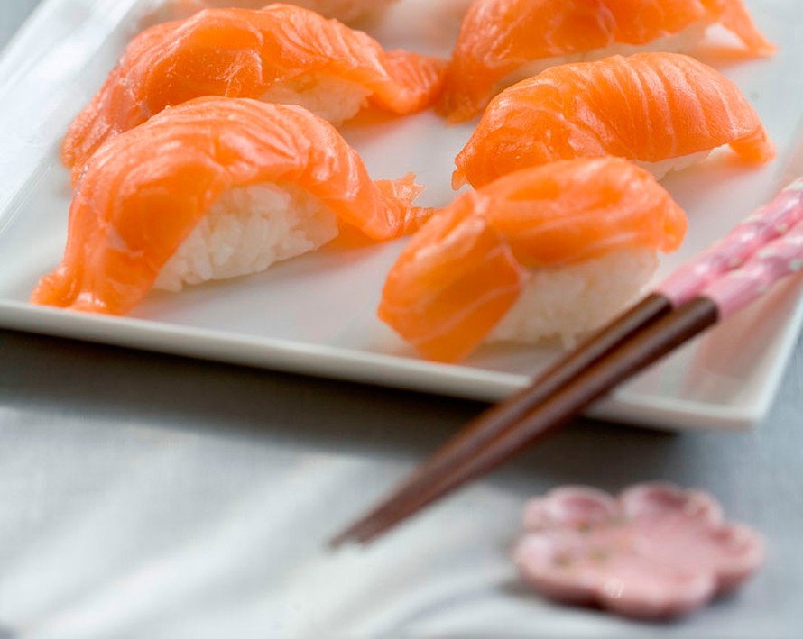 - Leikkaa lohi puolen sentin paksuisiksi viipaleiksi. Kalapala saa olla riisityynyä pidempi, niin että se laskeutuu riisin yli lautaselle. Lohiviipaleen paksuus on makuasia: Japanissa kala voi olla melkein sentin paksuinen, eurooppalaiset leikkaavat sen ohuemmaksi.