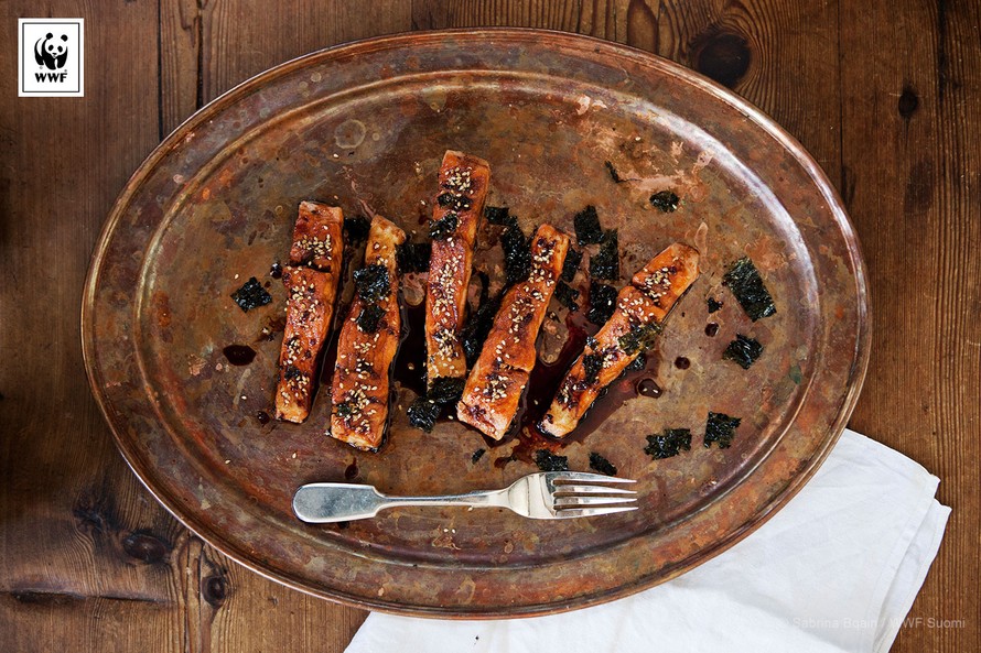 Asettele kalapalat astiaan ja kaada päälle maun mukaan teriayaki-kastiketta. Viimeistele halutetessasi merilevälastuilla ja paahdetuilla seesaminsiemenillä.