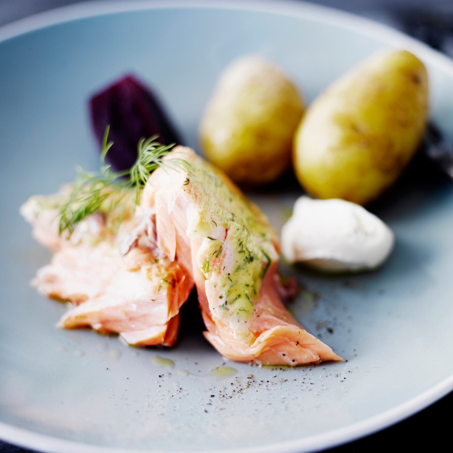 - Lohen kypsyeesä keitä perunat kypsiksi suolavedessä (2 tl suolaa/1 l vettä) ja paloittele etikkapunajuuret lisukkeeksi. Koristele annokset tillillä.