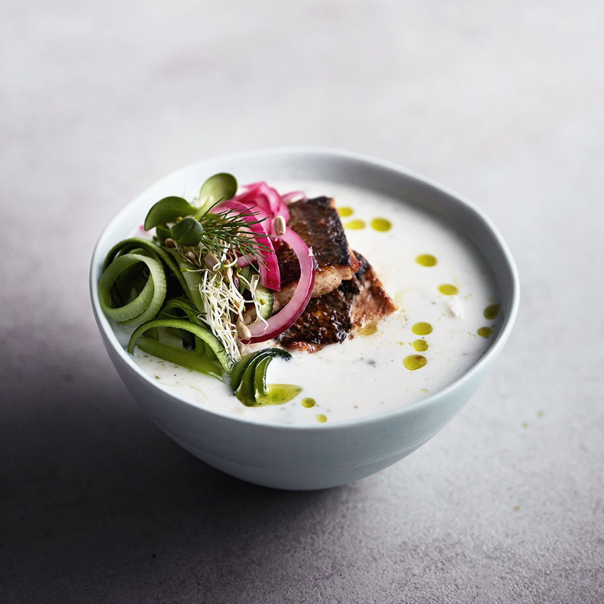 7. Kokoa annos laittamalla piimälientä kulhojen pohjalle. Nosta päälle kalapalat, kurkkua, sipulia, ituja, versoja ja tilliä. Ripottele pinnalle auringonkukansiemeniä ja valuta pinnalle tilliöljyä pisaroina.