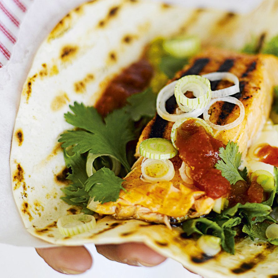 - Lämmitä tortillat grillissä. Lado lätyille guacamolea, ranskankermaa ja halutessasi tomaattisalsaa. Lisää lohta ja salaattia. Tarjoile heti.