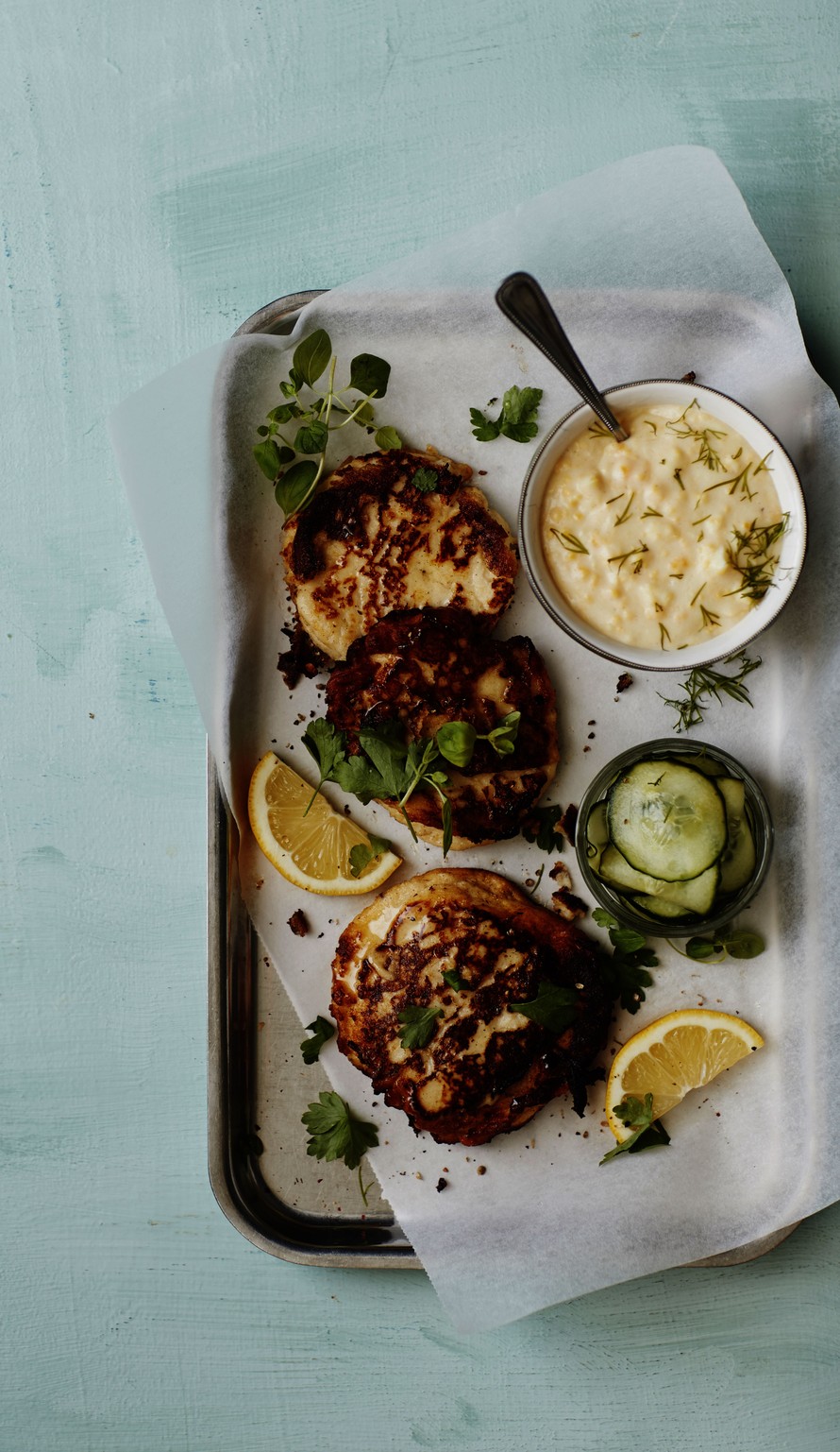 - Kuumenna uuni 200 asteeseen. Pyörittele taikinasta kostein käsin 5 pihviä ja paista ne voissa keskilämmöllä kultaisiksi, noin 5 minuuttia molemmin puolin. Siirrä pihvit uuniin 5 minuutiksi.