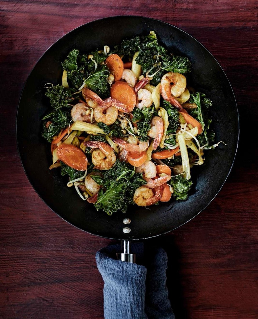 Kati Tervon ihanan yksinkertainen kasvis-katkarapuwokki maustetaan curryjauheella ja valkosipulilla. Pannussa kasvisten maut puhkeavat parhaimmilleen, joten tämä ruoka kannattaa syödä heti.
