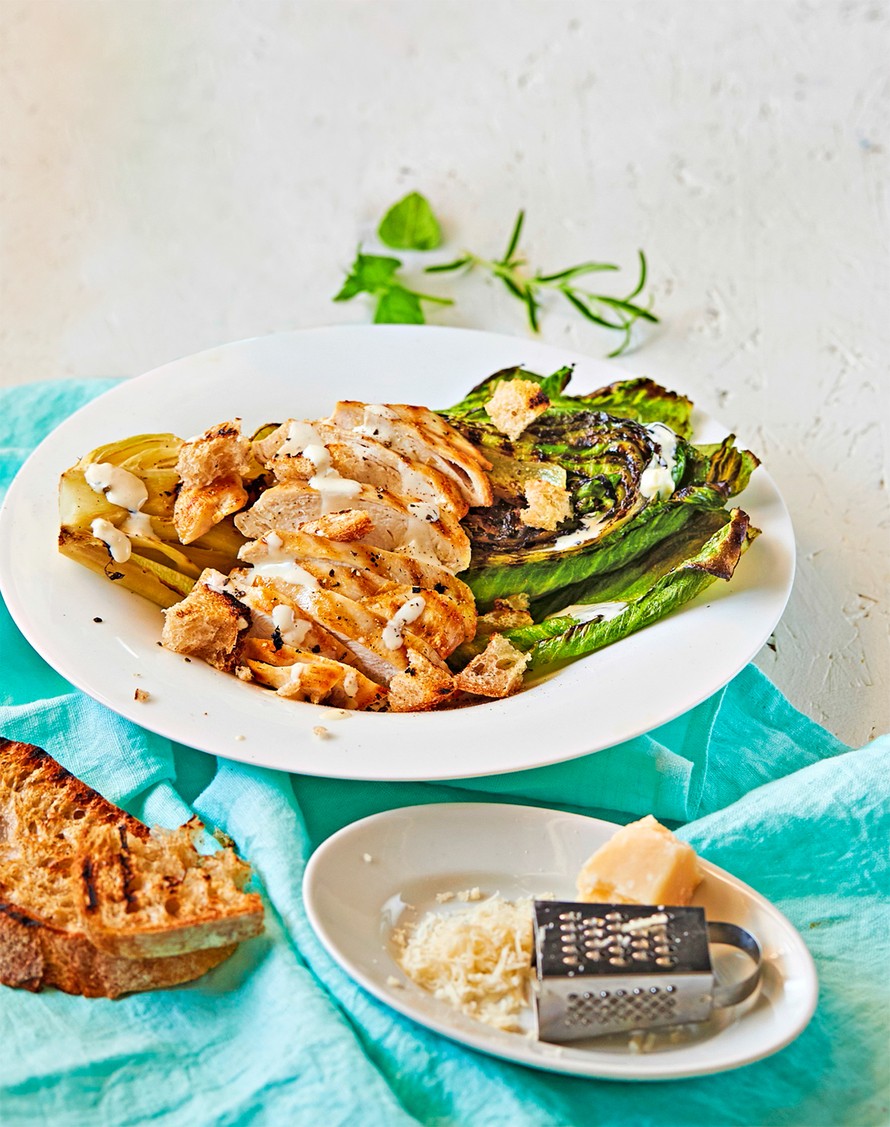 - Leikkaa romaine pitkittäin puoliksi. Sivele salaatin leikkuupinnat sekä broilerin rintafileet kevyesti öljyllä. Kypsennä rintafileitä grillissä keskilämmöllä noin 5–7 minuuttia. Lisää salaatit grilliin leikkauspinta alaspäin sekä leipäviipaleet. Jatka grillaamista vielä noin 3–5 minuuttia välillä grillattavia kääntäen, kunnes broileri on kypsää ja salaatit sekä leipäviipaleet kauniin ruskeita.