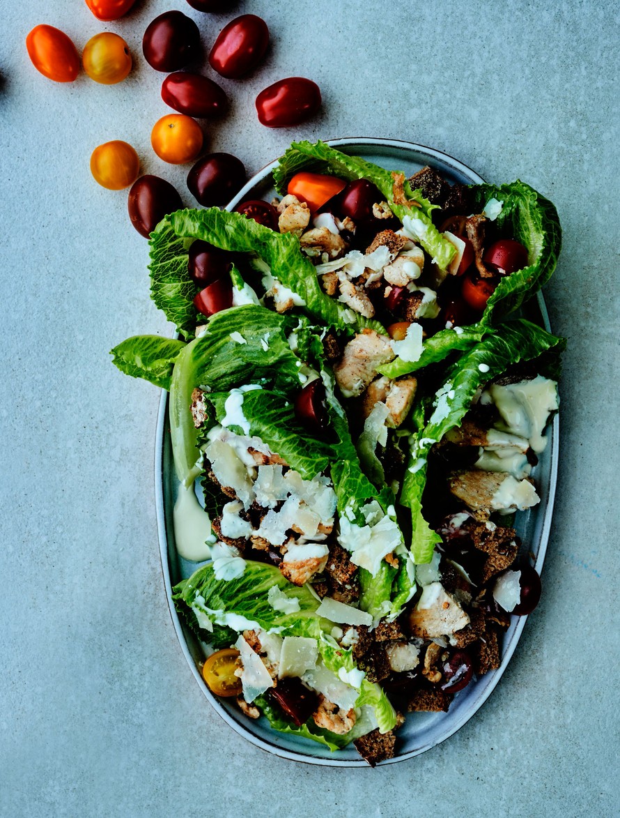 Caesarkastike valmistetaan majoneesin sijaan maustamattomasta jogurtista. Broilerille riittää mausteeksi sitruunamehu, joka antaa mukavasti kirpeyttä ja raikkautta.