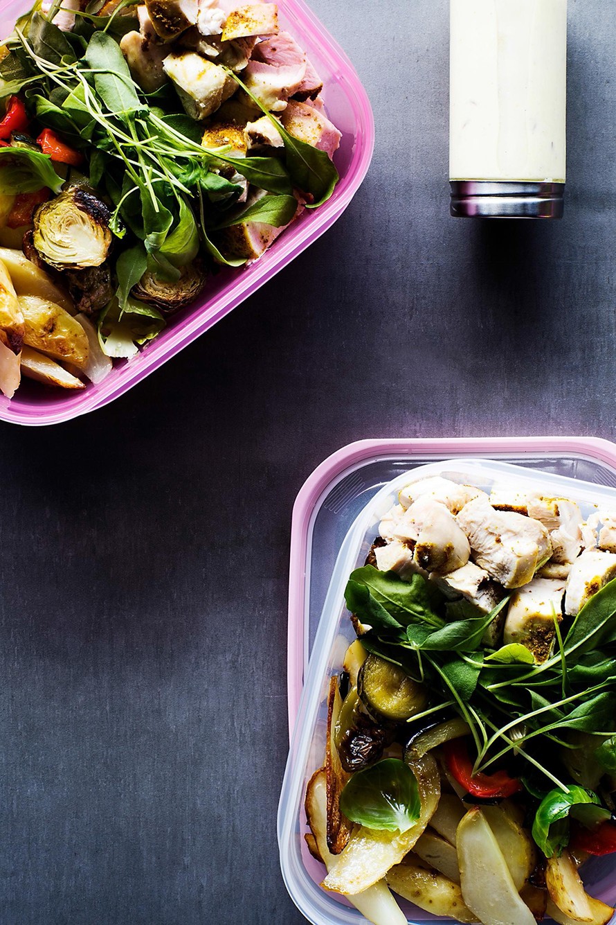 Tee lounas valmiiksi etukäteen. Paista kerralla iso satsi broilerinrintafileitä ja yhdistele raakojen tai kypsien kasvisten kanssa. Lisää annokseen vielä kourallinen täysjyväpastaa tai -riisiä, niin puhti ei lopu kesken päivän.