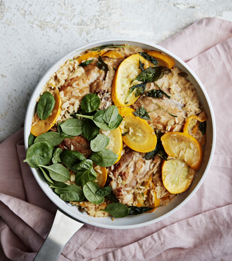 Kesäkurpitsa-broileripannu valmistuu yhdessä astiassa. Ainekset pannuun ja kansi päälle! Mehevä ruoka ei kaipaa lisukkeita.