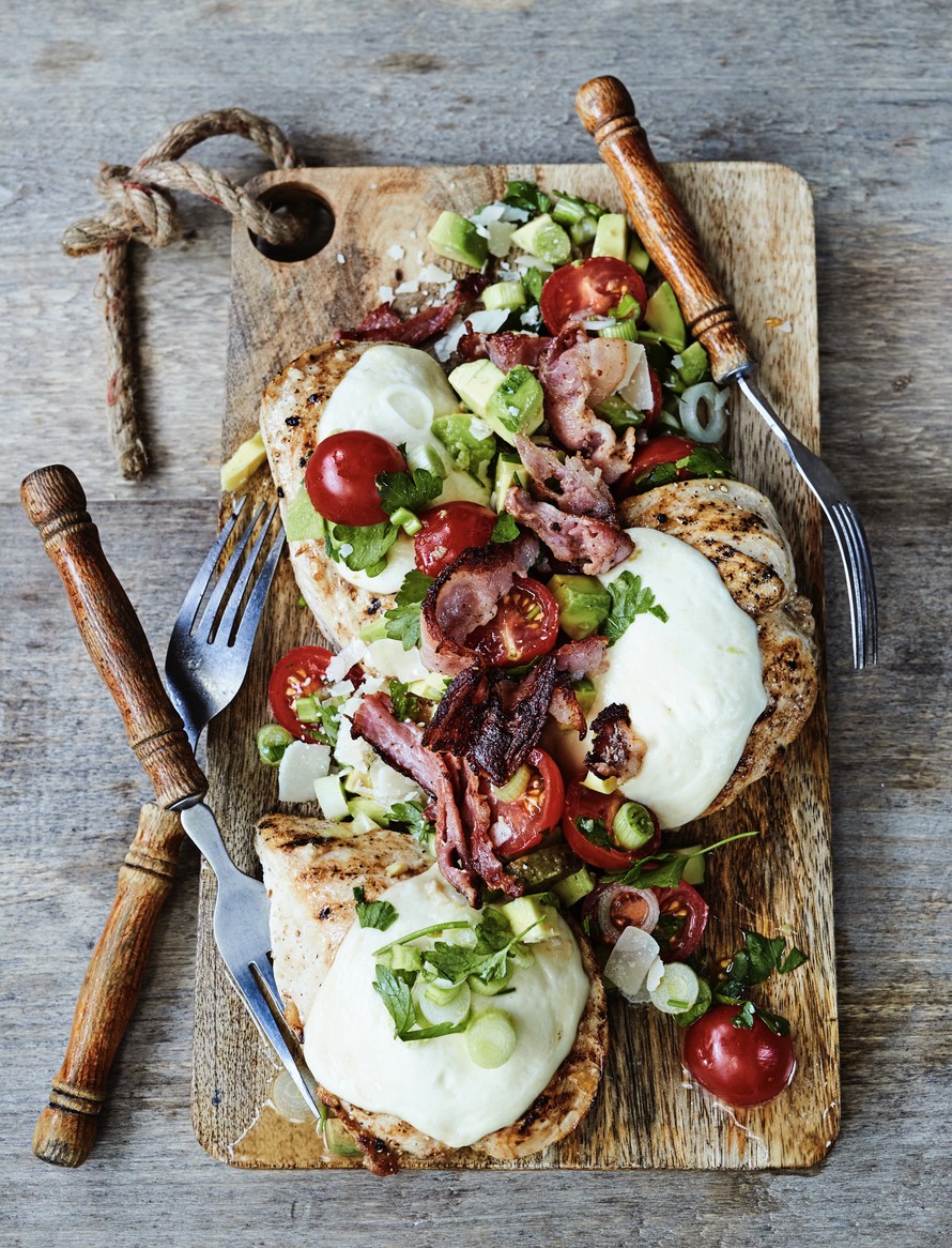 Broilerin rintafileet kuorrutetaan nyt mozzarellalla ja tarjotaan kalifornialaisittain tomaatti-avokadosalaatin kanssa. Höysteeksi sopii loistavasti rapeaksi paistettu pekoni.
