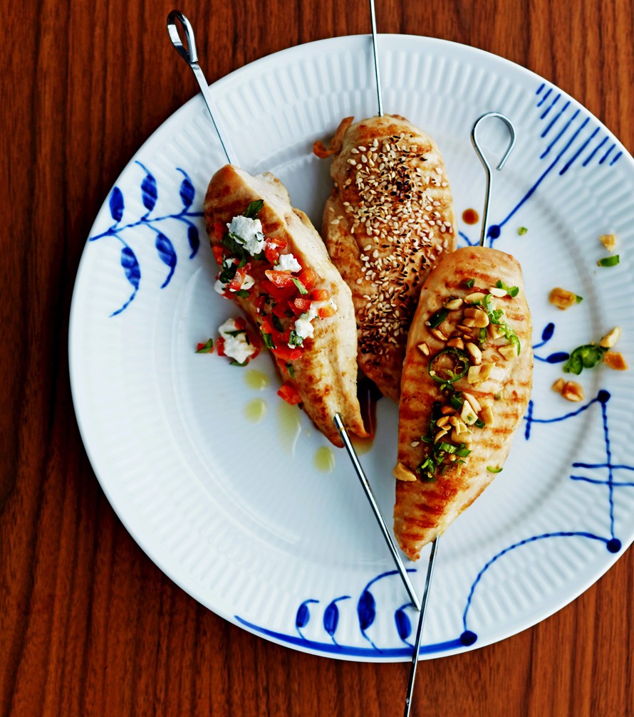 Meheväksi kypsennetty broileri saa pintaansa maukkaan mausteseoksen. Valitse rakuunaa ja vuohenjuustoa, inkivääriä ja seesamia tai tulisia suolapähkinöitä!