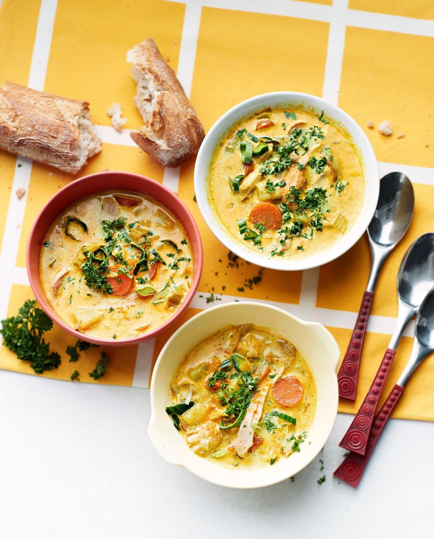 Lisää keittoon broilerin liha ja kerma. Keitä 10 minuuttia. Viimeistele keitto hienonnetulla persiljalla.
