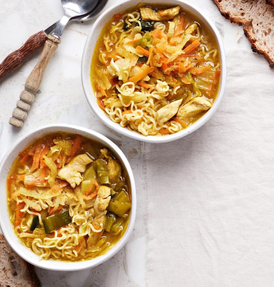 Keltajuuri antaa keittoon pirteän värin ja tuo samalla lisää syvyyttä makuun. Nuudelit imaisevat nopeasti keiton liemen, joten tarjoa keitto mieluiten pian valmistuksen jälkeen. Soppa maistuu toki myös patamaisena versiona.