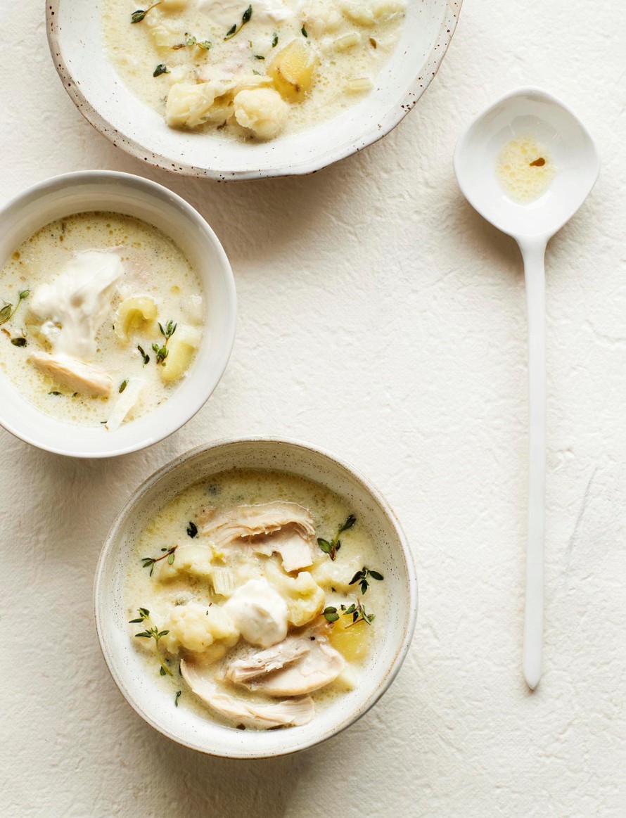 Täyteläinen keitto valmistuu kahden kerman taktiikalla. Broilerista tulee rakenteeltaan ihanan pehmeää, kun se upotetaan liemeen kiehumaan ruskistamatta.