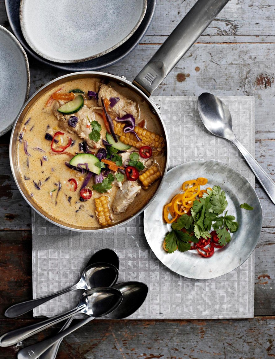 Kuumenna öljy kattilassa. Paista broilerit öljyssä kypsäksi. Lisää currytahna ja vihannekset. Paista vielä 5 minuuttia.