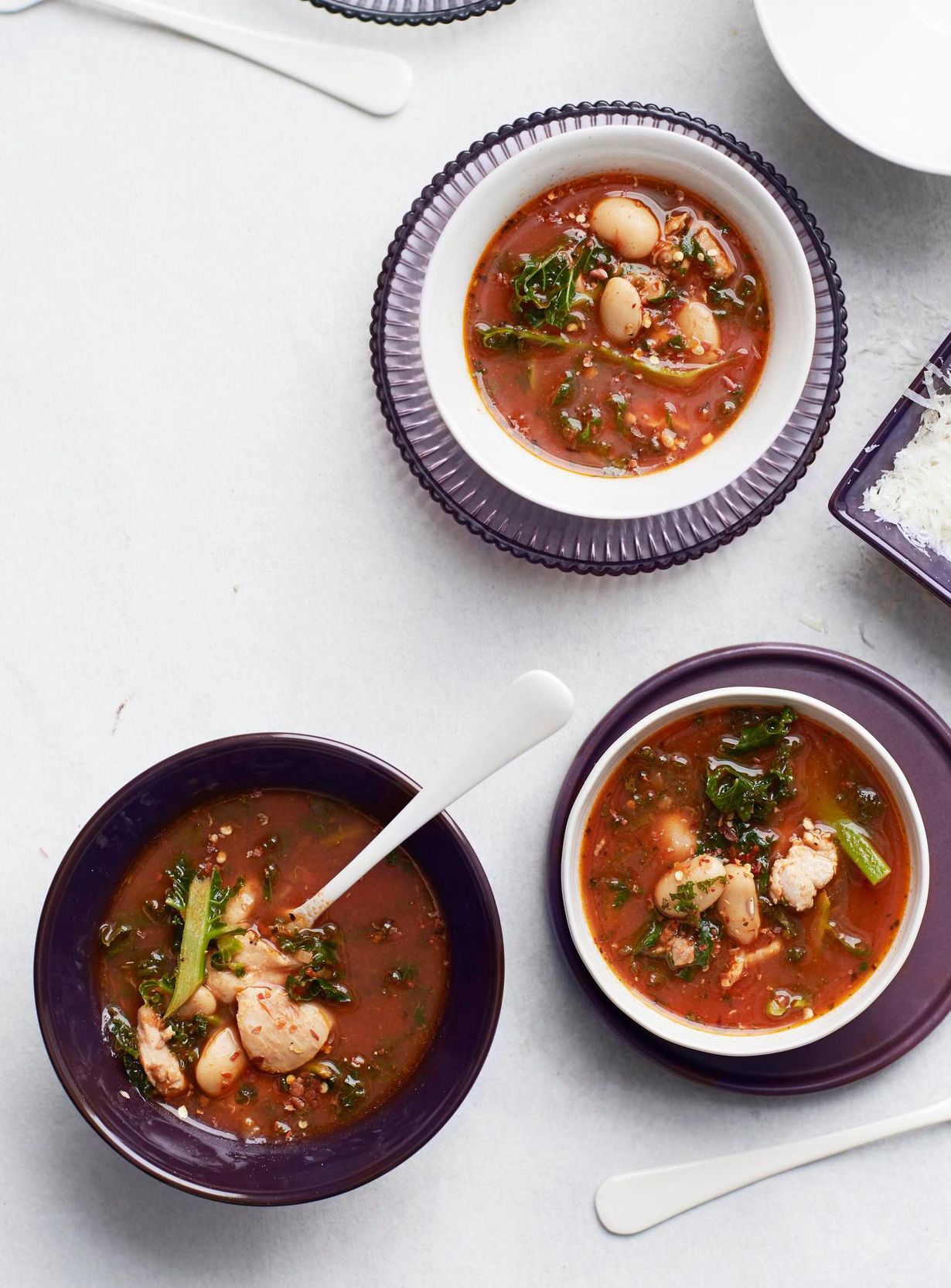 Lämmittävässä keitossa on proteiinia kanan lisäksi myös pavuissa. Voimavihannes lehtikaali keventää soppaa.