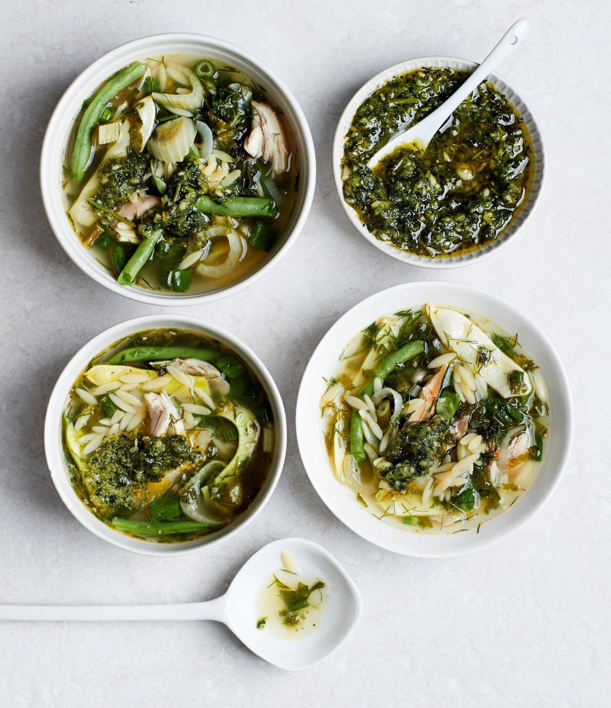 Keitä vihanneksista ja grillibroilerista nopea ja helppo keitto. Vihreän minestronen juju on sitruunamelissapestossa, jossa juusto on korvattu samettisilla macadamiapähkinöillä.