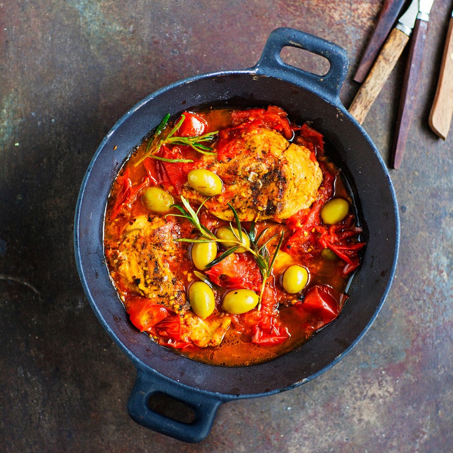- Kuutioi tomaatit ja paloittele oliivit pataan. Anna poreilla ilman kantta vielä 10 minuuttia. Lisää kanalientä, mikäli pata kuivuu liikaa. Tarjoa höyrytetyn riisin kanssa.