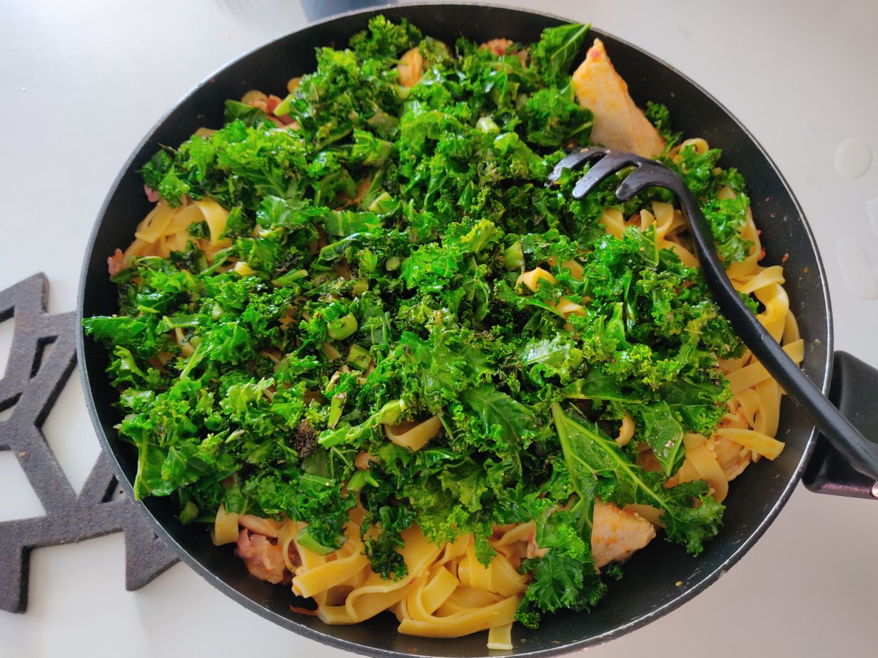 Ajvar-kanaa lehtikaalin ja tagliatellen kera