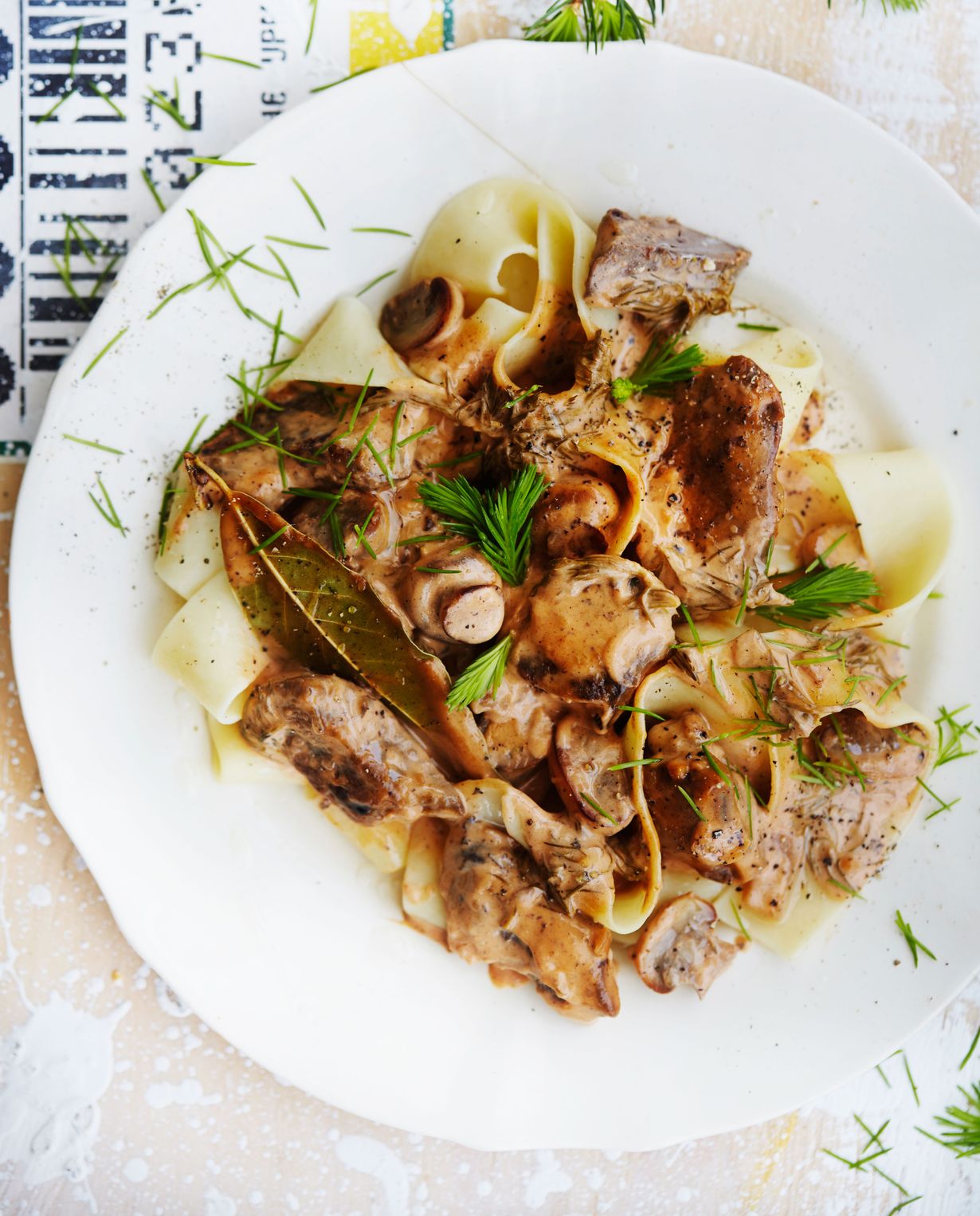 - Sekoita valkoviini, tomaattipyree ja laakerinlehti pannussa ja anna kiehahtaa. Keitä lientä kasaan 3–5 minuuttia. Lisää 2 dl kerkkiä, paistetut sienet, sipulit ja broilerinmaksat sekä kerma. Keitä 5 minuuttia. Mausta suolalla.