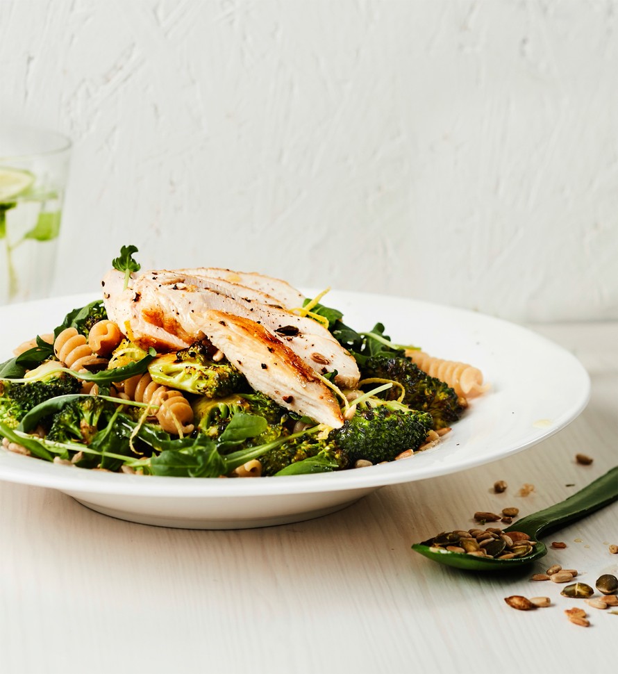Kevyeen pastaan yhdistetään ronskisti vihreää ja rutkasti proteiinirikasta broileria. Viimesilauksen maukkaalle pastalle antaa sitruunan kuori.