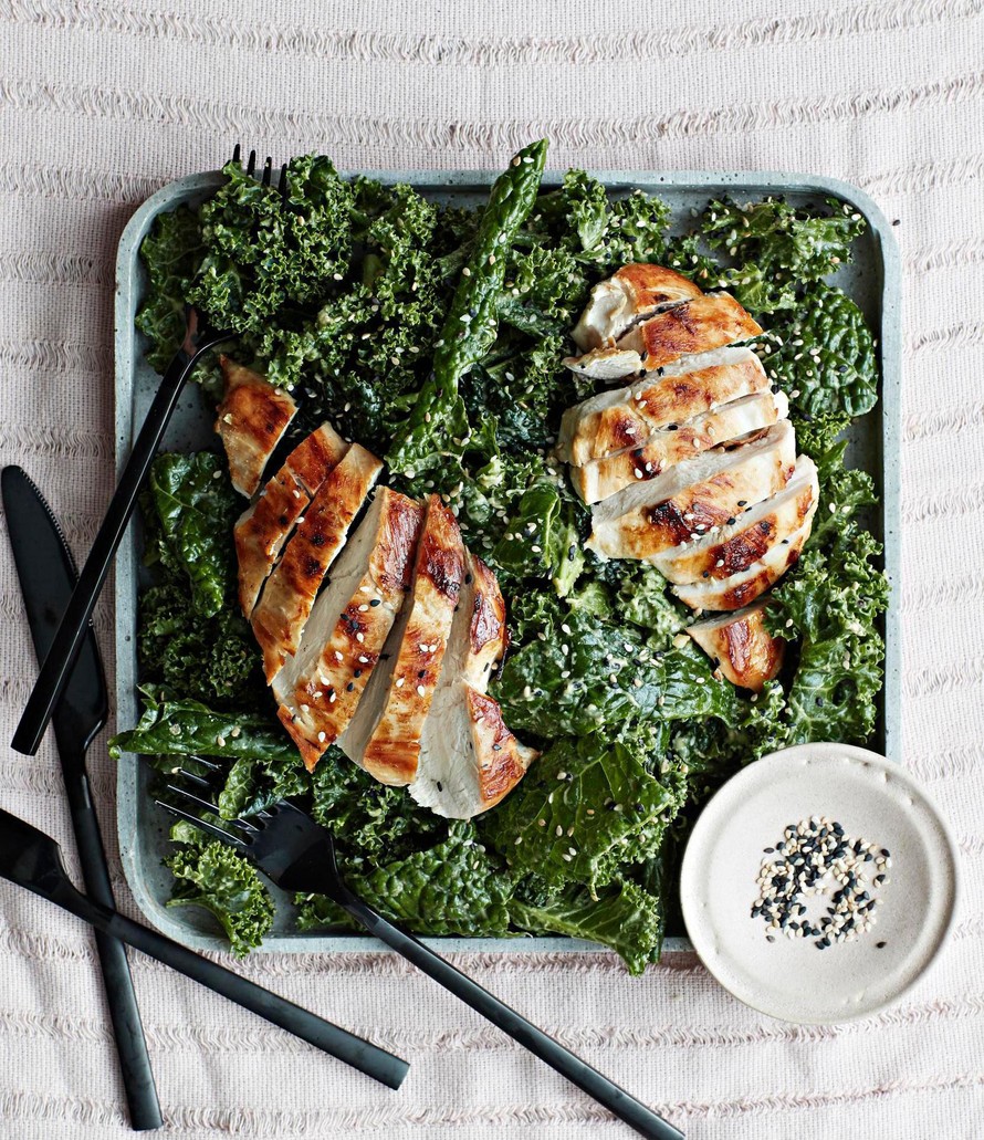 Lehtikaalin paras ominaisuus salaatissa lienee se, ettei se kavahda lämpimiäkään höysteitä. Lisukkeeksi tarkoitetun broilerin voi siis tarjota salaatin kanssa kuumana suoraan pannulta.