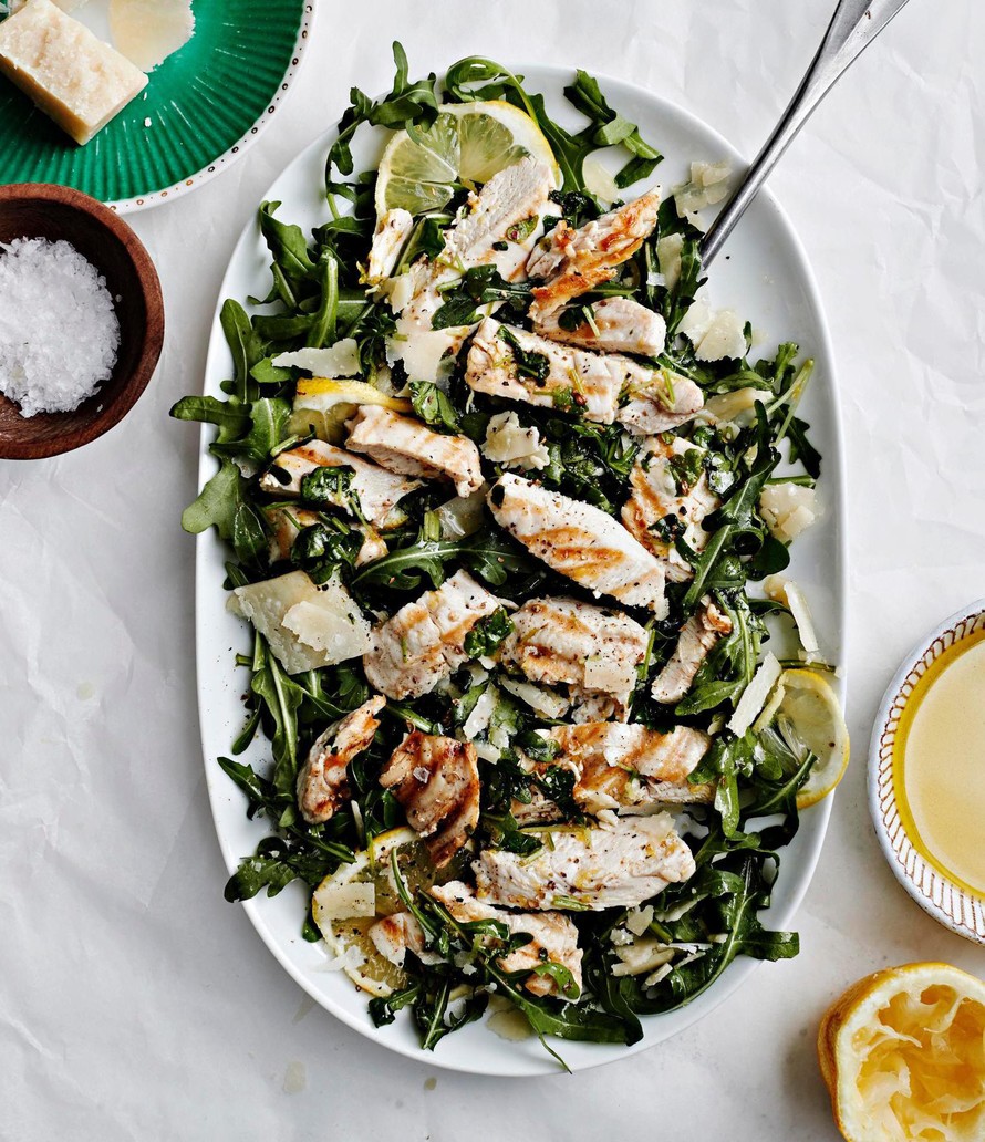 Maukkaat broileripalat nostetaan vadille levitetyn rucolan päälle ja salaatti viimeistellään parmesaanista vuolluilla lastuilla. Välimerellisten makujen yhdistelmä on pettämätön.