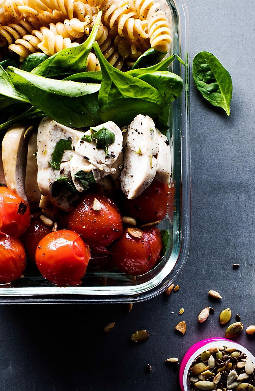 - Kasaa broileriviipaleet, keitetty pasta, kirsikkatomaatit ja salaattipinaatti lounasrasiaan omiin lohkoihinsa. Valuta loppu broilerin marinadi annoksen päälle. Pakkaa raejuusto ja siemensekoitus omiin pikkurasioihinsa.