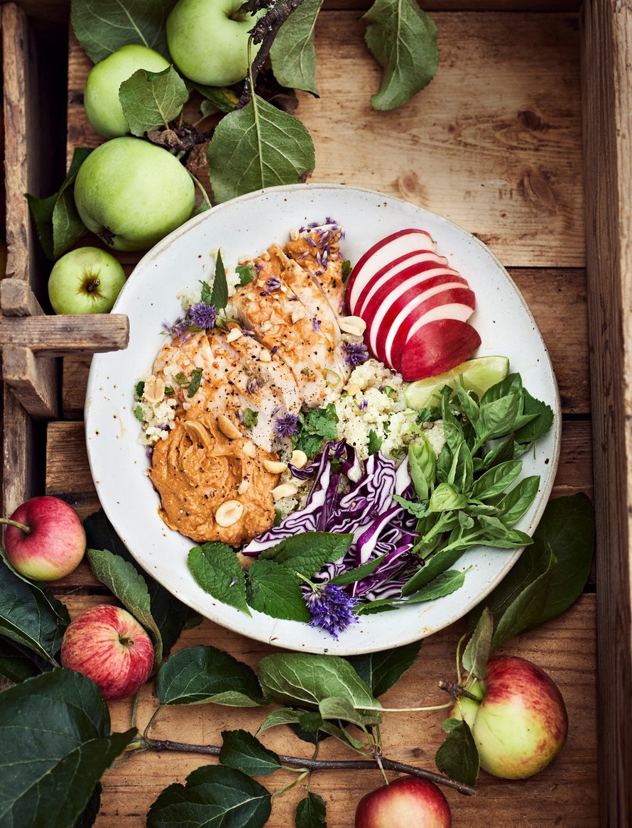 Laita kulhon pohjalle keitettyä kvinoaa. Nosta päälle broileria, omenaa, kurkkua ja kaalia. Lisää loput pähkinäkastikkeesta, kaali ja yrtinoksat.