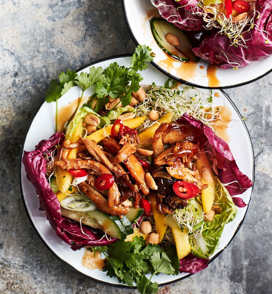 Viipaloi mango ja kurkku. Lisää joukkoon idut, korianteri ja pähkinät. Irrota salaateista lehdet kokonaisina ja laita ne lautasille päällekkäin kipoiksi tai revi salaatit pediksi. Laita kurkku-mangosalaattia salaattikuppeihin ja lusikoi päälle reilusti broileria.