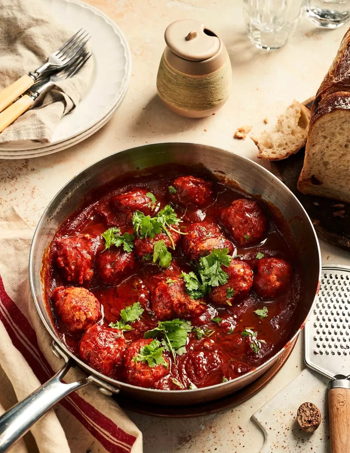 Helppotekoiset broilerinjauhelihapyörykät nostetaan bbq-kastikkeella ja maustepippurilla maustetun tomaattikastikkeen joukkoon kypsymään.