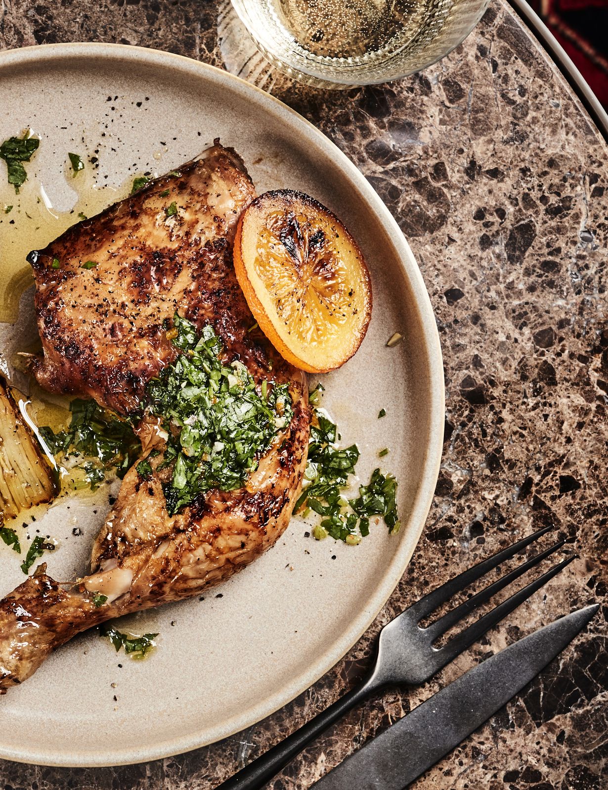 Arkisista broilerin koipireisistä kehkeytyy mahtava herkku, kun niiden annetaan paahtua uunissa sitrusviipaleiden kanssa ja kaveriksi pyöräytetään pirteä persillade.
