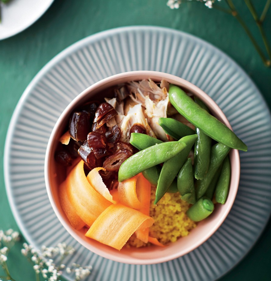 - Pilko taatelit paloiksi veitsellä. Kuori porkkana ja suikaloi se kuorimaveitsellä. Sulata sokeriherneet juoksevan veden alla siivilässä. Perkaa kanankoivesta syötävät osat irti. Kokoa kaikki ainekset kulhoon.