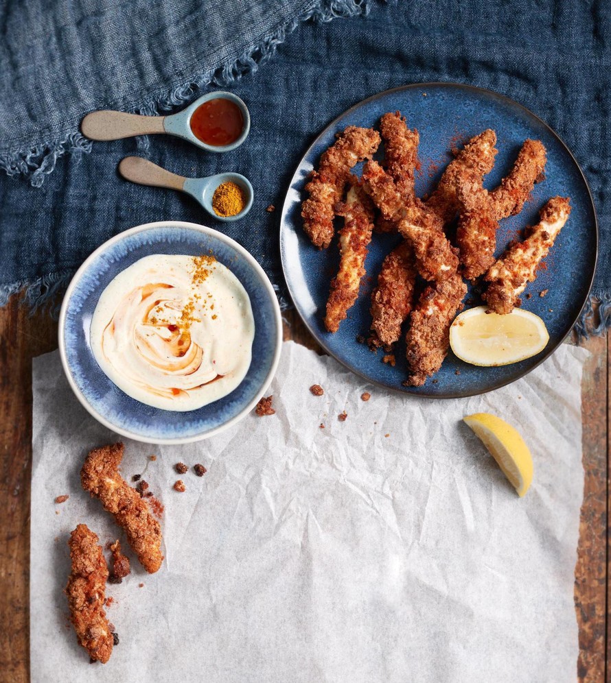 Pyörittele kanapalat ensin maissitärkkelyksessä, sitten kananmunassa ja lopuksi hapankorpuissa niin, että lihat ovat kauttaaltaan kuorrutuksen peitossa.