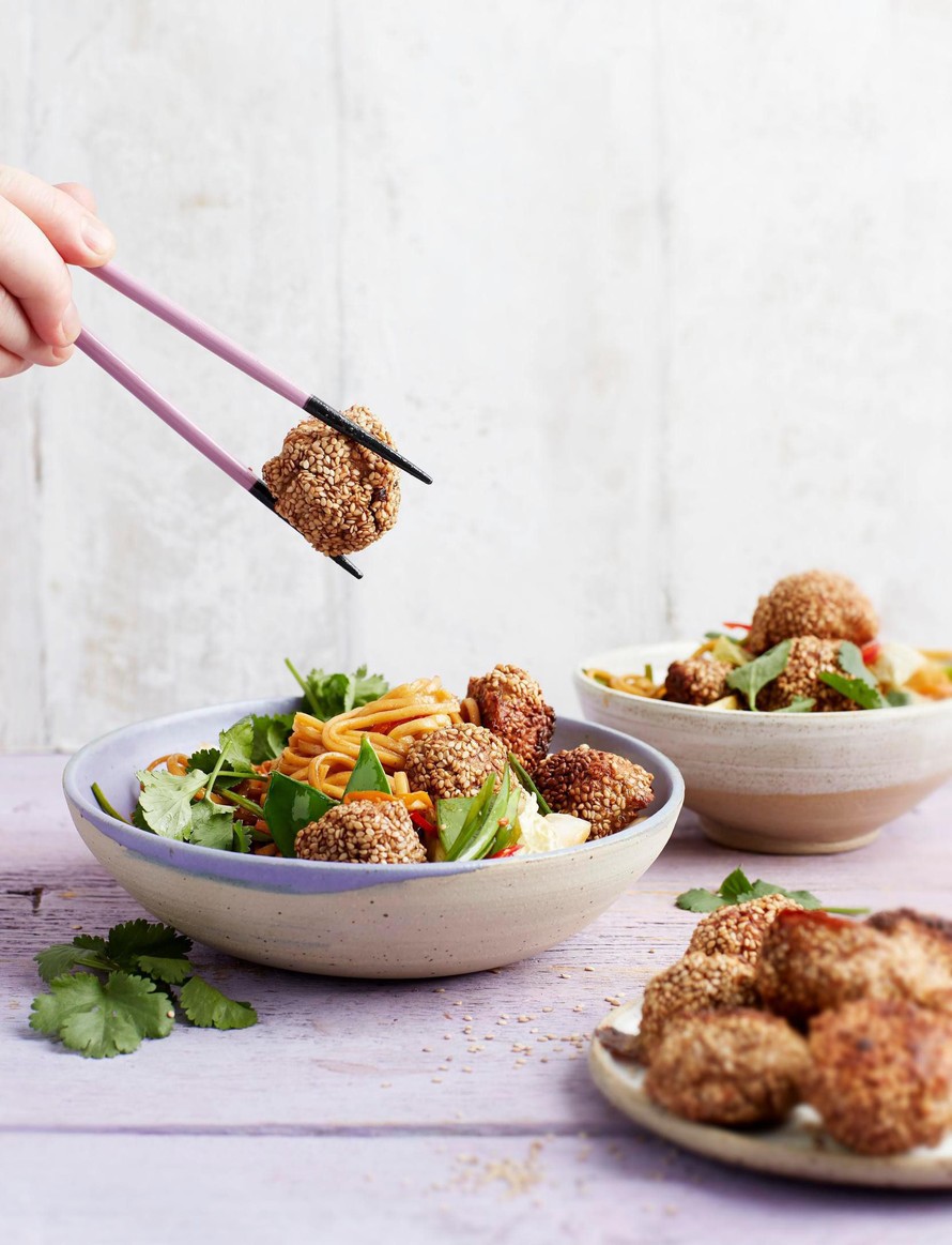 Kuumenna öljy pannulla. Paista porkkanoita 2–3 minuuttia. Lisää sipulit, kaali ja herneet pannulle, paista hetki. Sekoita joukkoon nuudelien maustepussi ja hoisin-kastike. Lisää lopuksi nuudelit, korianteri ja pyörykät.