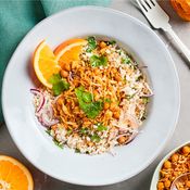 - Nosta vuoka uunista. Purista päälle limetin mehua. Leikkaa punasipuli ohuiksi puolirenkaiksija ripottele ruokaan. Viimeistele korianterilla tai lehtipersiljalla.