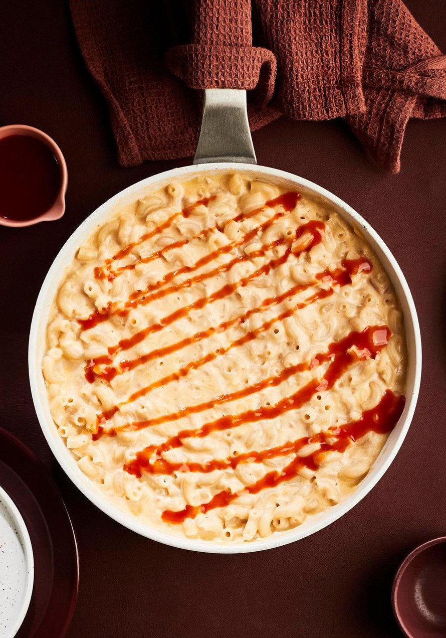 Broilerin suosio on huipussaan. Sitä voi kokeilla tuhdin makaronista ja juustosta koostuvan mac & cheese -vuoan täytteenä. Tulinen siipikastike maustaa vuoan antamalla sille kunnolla potkua.