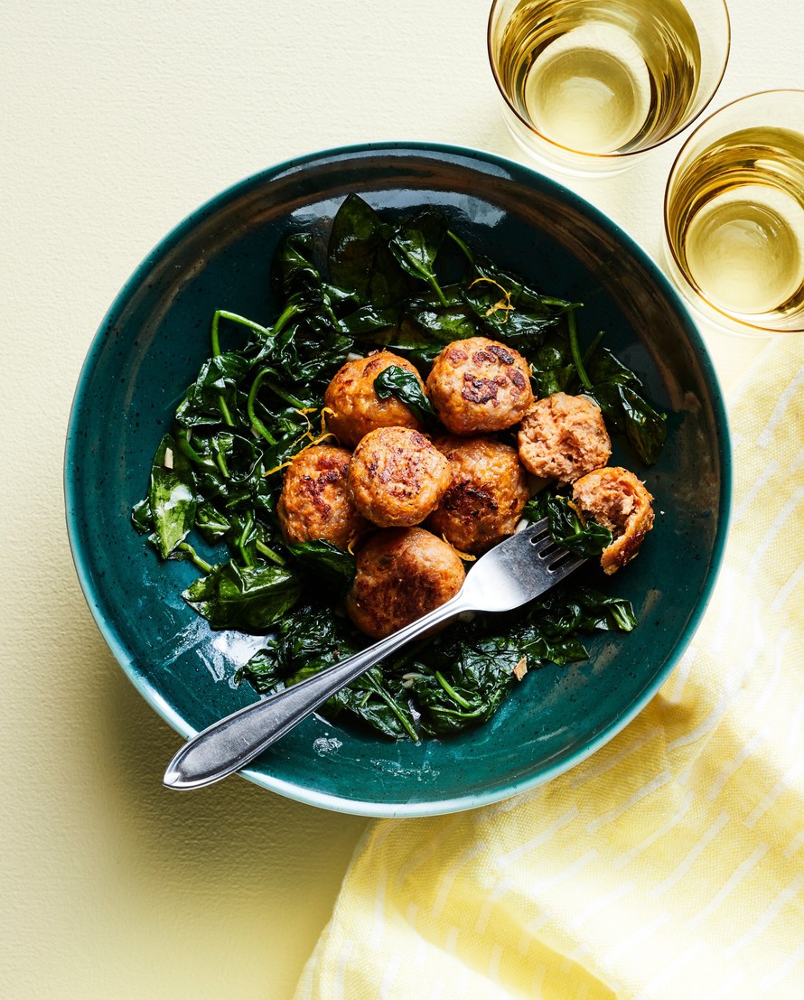 Manteliset broileripyörykät ja pikapaistettu pinaatti