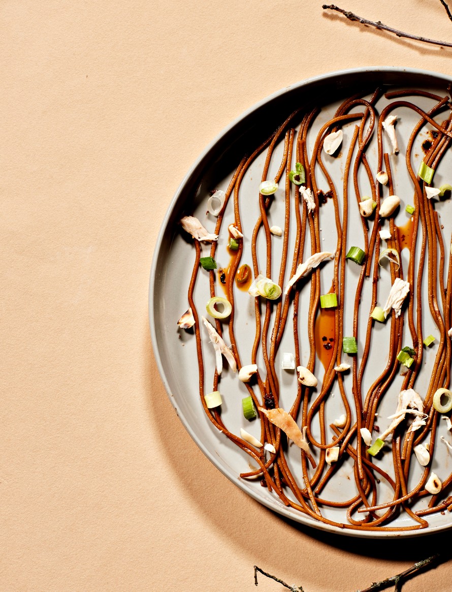 Sekoita kastike nuudeleiden joukkoon ja jaa nuudelit kulhoihin. Lisää broilerit, kevätsipuli ja maapähkinät. Tarjoa heti.