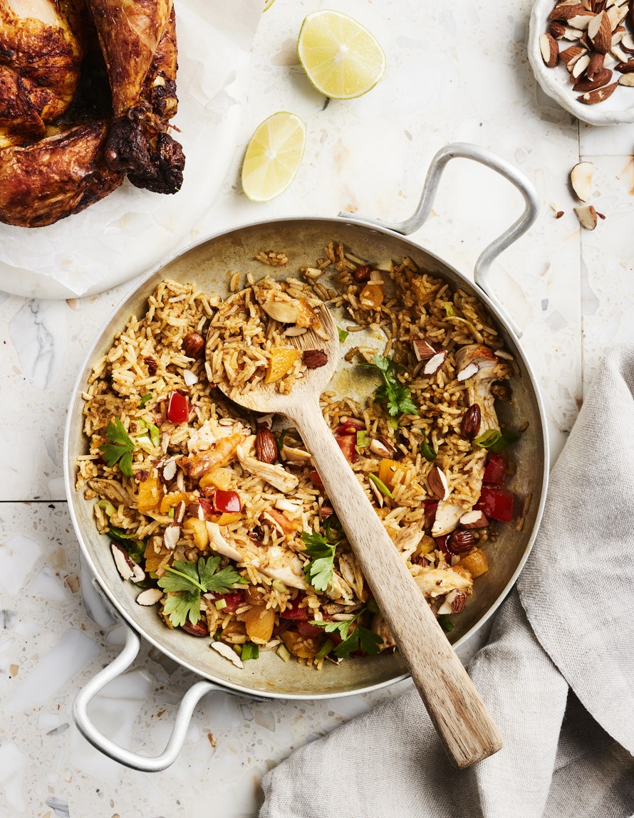 Oikaistu, intialaisesta biryanista vaikutteita ottanut ateria syntyy keitetystä, kylmästä riisistä pannulla paistaen ja kaupan valmiilla currytahnalla maustaen.