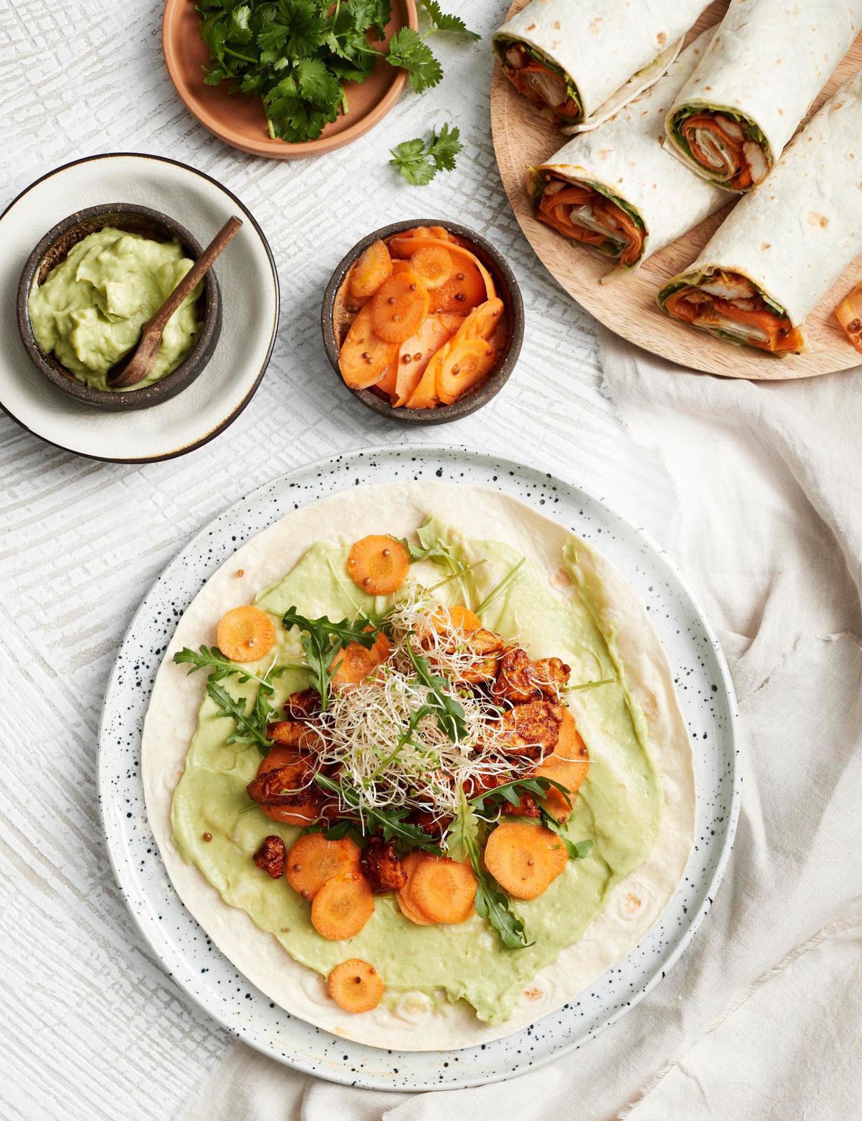 - Levitä tortillojen päälle avokado-kastiketta. Ripottele päälle kanapaloja, maustettuja porkkanoita, rucolaa ja ituja. Kääri rullalle. Halkaise rullat kahteen palaan.