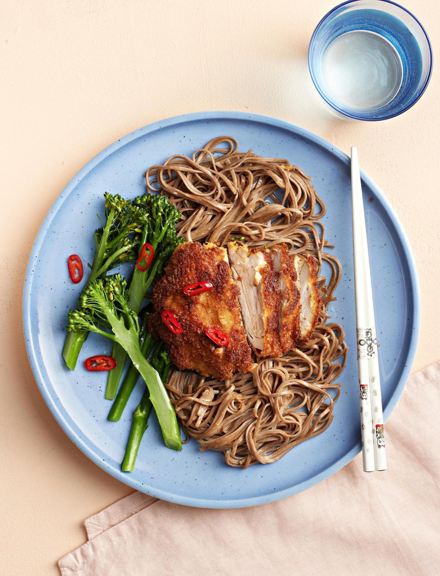 Sokeriton ranskalainen sinappi antaa juuri sopivasti ytyä broilerin makuun. Yhdistä rapeapintaiseksi paistettu broileri sobanuudeleiden ja kasvisten kanssa.