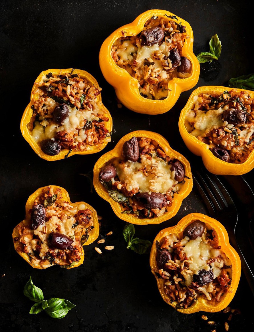 - Pese ja halkaise paprikat. Poista siemenet. Lusikoi täyte paprikoihin. Ripottele pintaan loppu juustoraaste ja muutama oliivi. Kypsennä paprikoita uunissa noin 30 minuuttia.