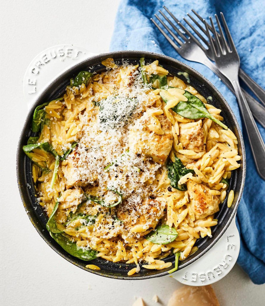 Kreikkalainen jyväpasta orzo toimii mainiosti yhden padan ruoissa. Se imee itseensä ihanasti makua kypsyessään eikä kärsi hieman venähtäneestä keittoajastakaan.