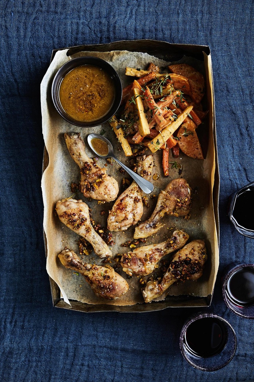 Rapeanmakea pinta tekee broilerinkoivista ihanaa viikonloppuruokaa. Maun salaisuutena ovat hunajassa pyöritellyt pistaasit. Tarjoa broilerit omenakastikkeen ja hunajakasvisten kanssa.