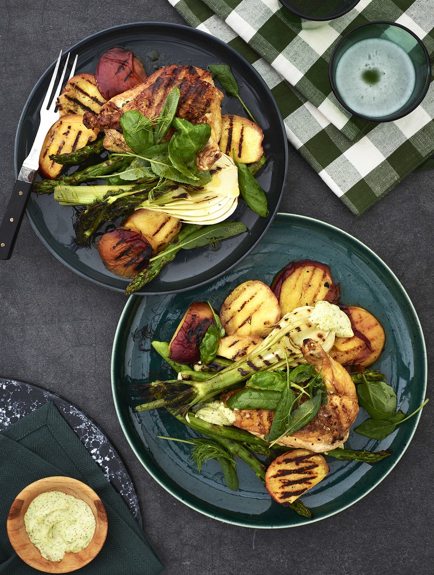 Kananrinnat mehevöitetään maustevoilla ja tarjotaan grillattujen hedelmien ja kasvisten kera.