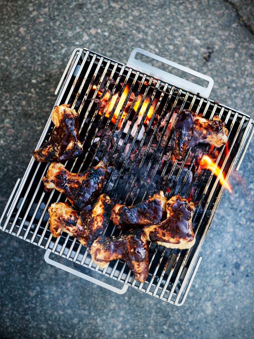 - Kuumenna grilli. Grillaa siipiä kaasugrillissä keskilämmöllä tai hiiligrillissä epäsuoralla tulella noin 5-10 minuuttia molemmin puolin. Sivele siivet suklaakastikkeella ja valele karpaloketsupilla.