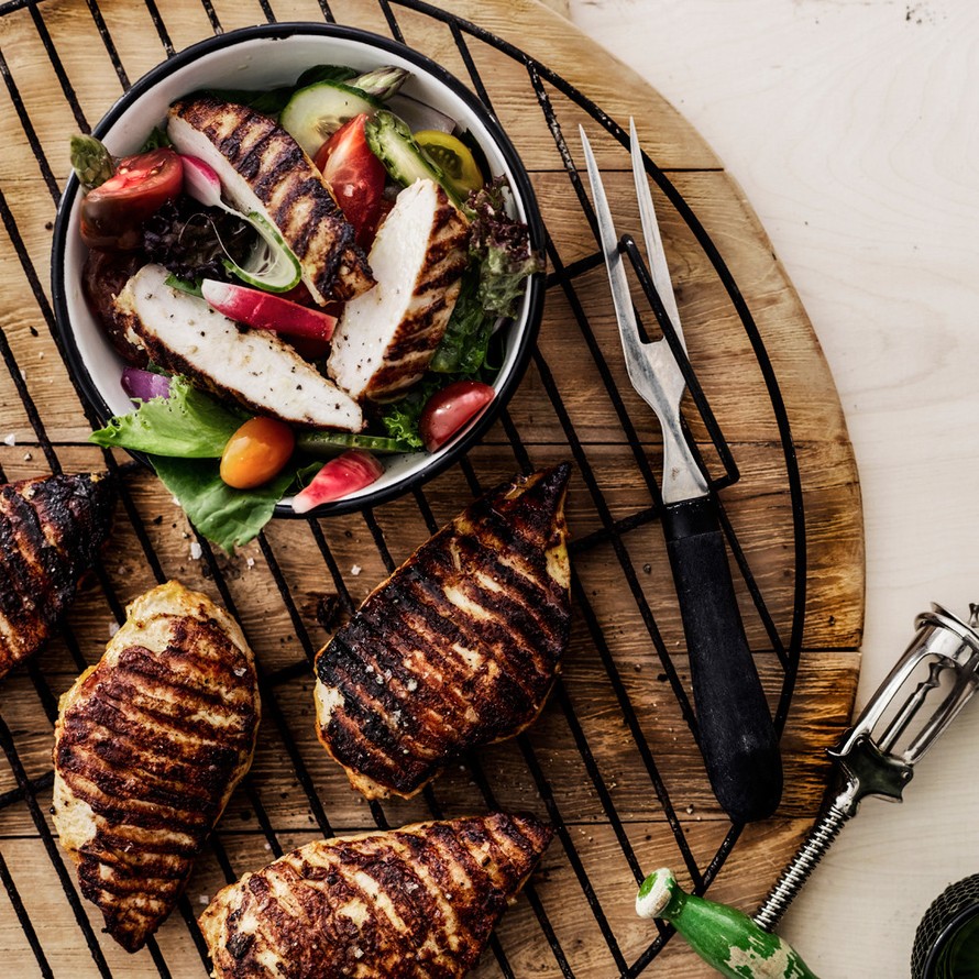 - Kuumenna grilli keskilämmölle. Pyyhi rintafileet puhatiksi marinadista ja grillaa noin 4 minuuttia kummaltakin puolelta. Jos käytät paistolämpömittaria, lihan sisälämpötilan tulisi olla 72 astetta. Anna vetäytyä lämpimässä paikassa, esimerkiksi astiassa kannen alla 10 minuuttia.