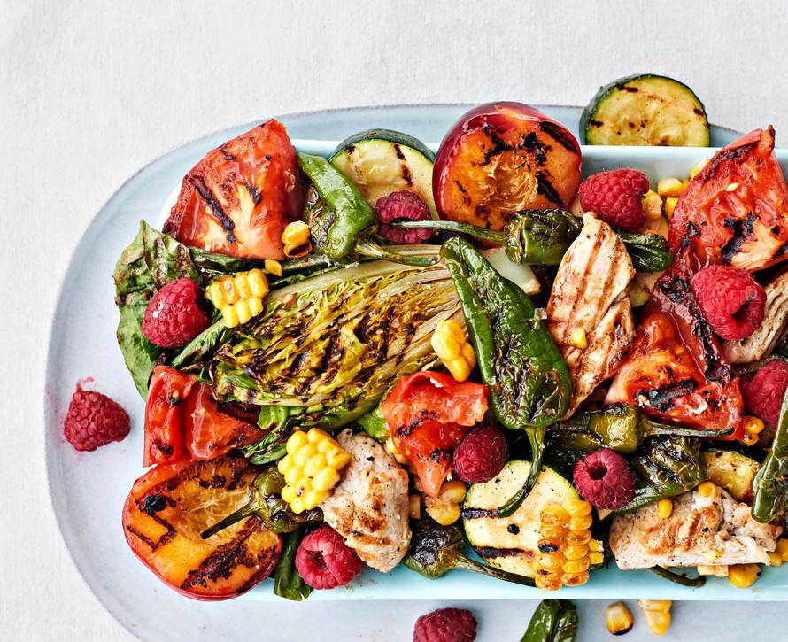Kun kasvikset laittaa grilliin, niiden luonnollinen makeus korostuu ja maut pehmenevät. Siksi mausteita voi käyttää runsaalla kädellä. Viimeistele salaatti halutessasi vadelmilla.