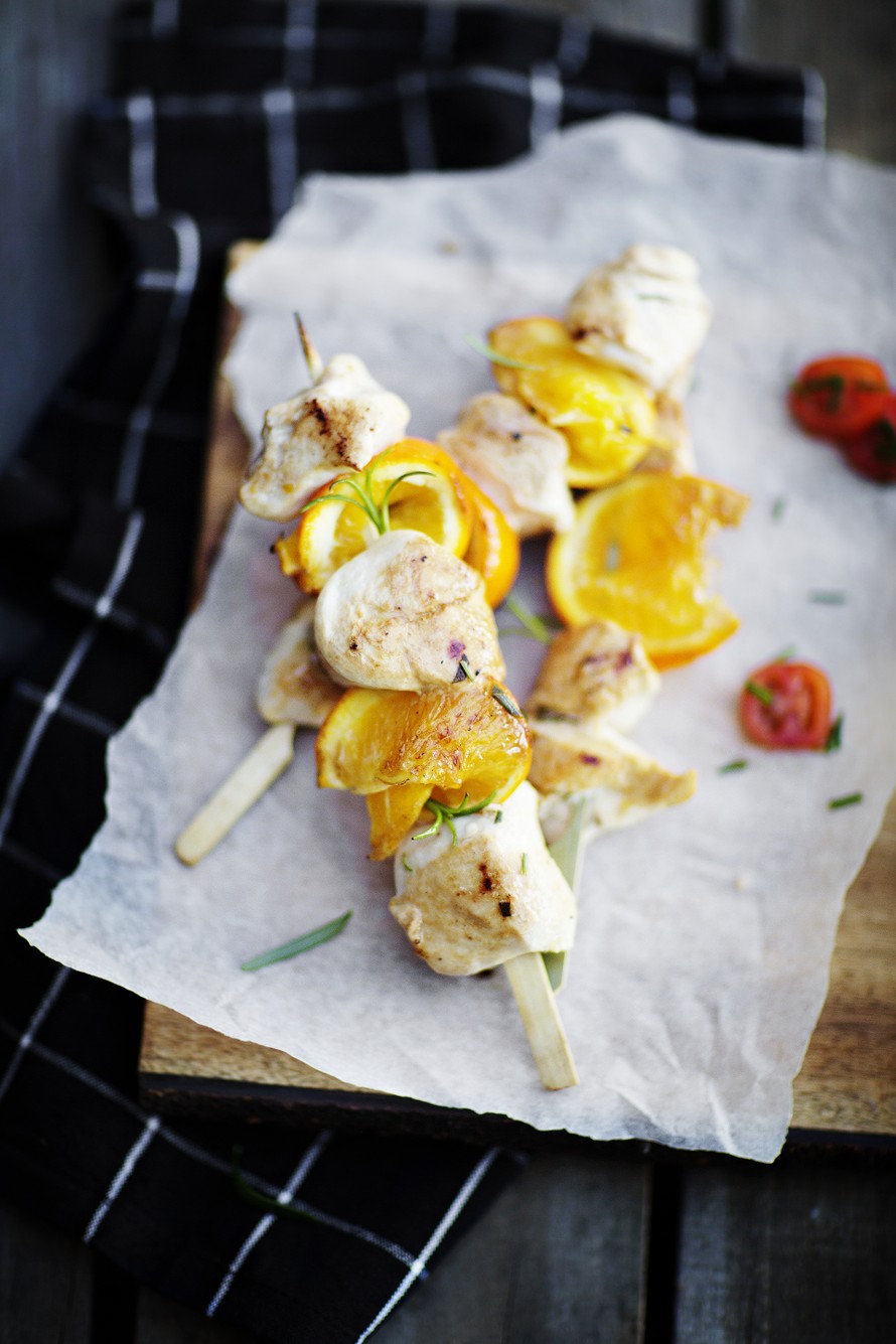 Liota puisia varrastikkuja puoli tuntia kylmässä vedessä. Leikkaa marinoidut broilerinfileet 2 cm:n paloiksi. Huuhtele ja lohko appelsiinit. Pujottele varrastikkuihin vuoroin broileripaloja ja appelsiinilohkoja.