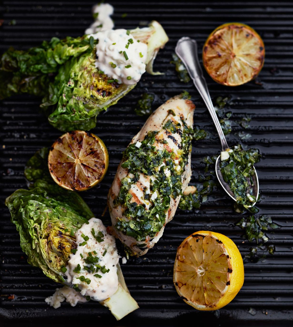 Tarjoa grillibroileri italialaisen sitruunaöljy-oreganokastikkeen salmoriglion kanssa ja grillaa seuraksi steakhouse-salaatti, joka maistuu sinihomejuustolla ryyditetyn majoneesin kanssa.